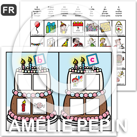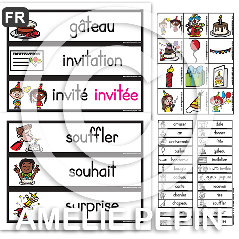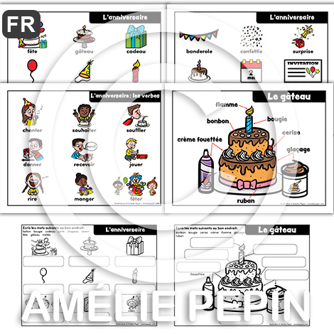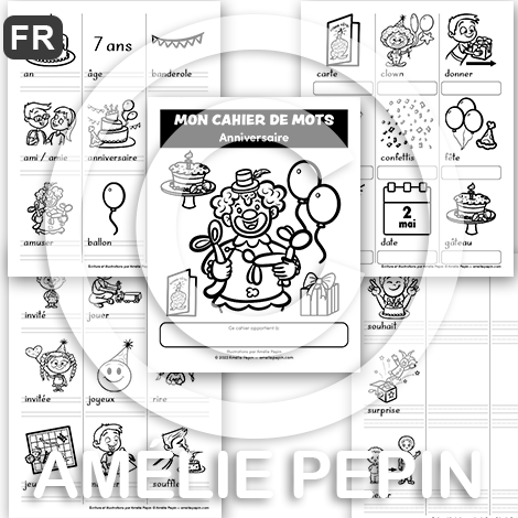 Anniversaire - Liste de 32 mots illustrés (script et cursif)