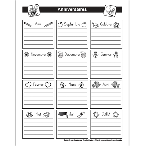 Alimentation Animaux Anniversaire Château (Moyen Âge) Cirque Corps humain Couleurs Créatures légendaires Dinosaures École Émotions Espace et planètes Famille Ferme Fête des Mères Fête des Pères Figures planes et solides Halloween Insectes et bestioles Jardinage Jungle et zoo Maison Mer et monde marin Météo Monde polaire Moyens de transport Musique Noël Pâques Pirates Poisson d'avril Pommes Saint-Valentin Saisons Sports et Olympiques Temps des sucres