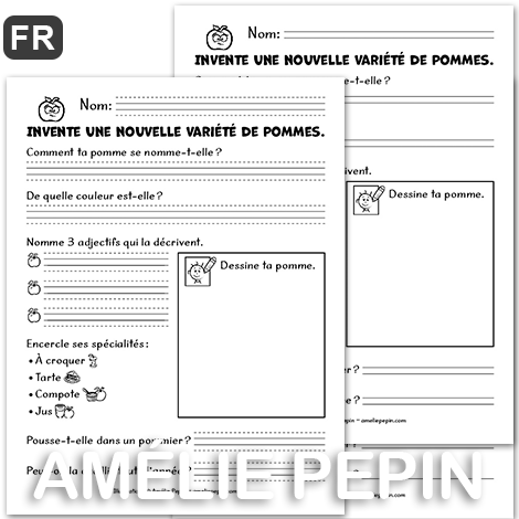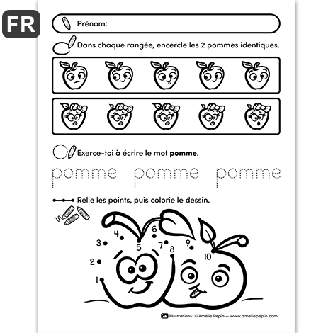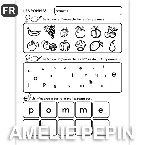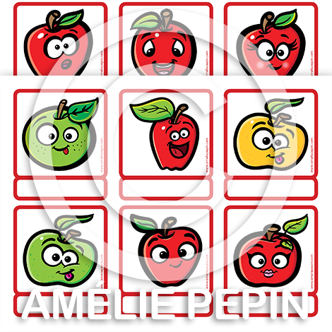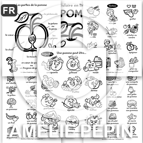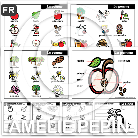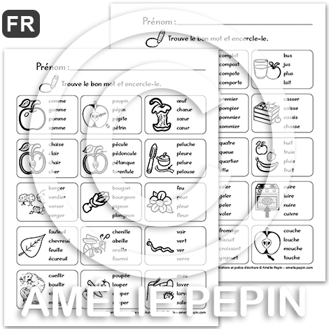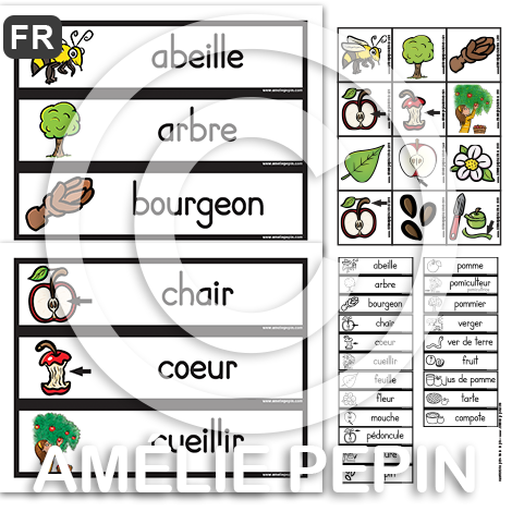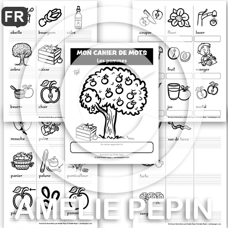 Les pommes - Liste de 32 mots illustrés (script et cursif)